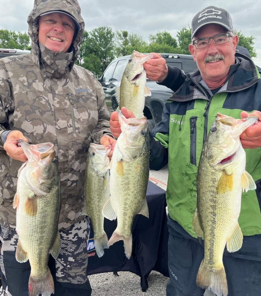 Eric Tapia and Steve Shows had a memorial day on the water in 2 key areas (holding on) targeting wind-blown rocky points with jerk baits and crawl cranks. Once the winds really kicked in and the bite slowed down they finished up focusing on 4 to10ft depths where there was no wind presenting shakey heads, TRD’s and boated their biggest bass at 5.79 lbs on a brush hog. They took home $ 360.00 and a 3rd place finish.