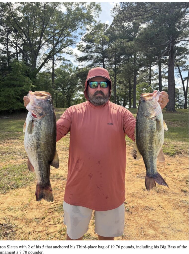 Arron Slaten with the Seven Coves Bass Club finished third overall with a 5 fish limit weighing in at 19.76 pounds, anchored by the Big Bass of the day a 7.70 pounder. Arron stated that as he was idling out of a ramp, on Friday morning, he graphed some rip rap leading into the cove and noticed a lot of bait in the area, he made a few cast and got a few bites and decided to leave it alone. On tournament morning he was one of the first boats there and spot locked on a spot where he could fan cast around the point and a ledge with a Carolina rig, Arron says he caught between 40-50 fish throughout the day and culled four or five times to his final weight.