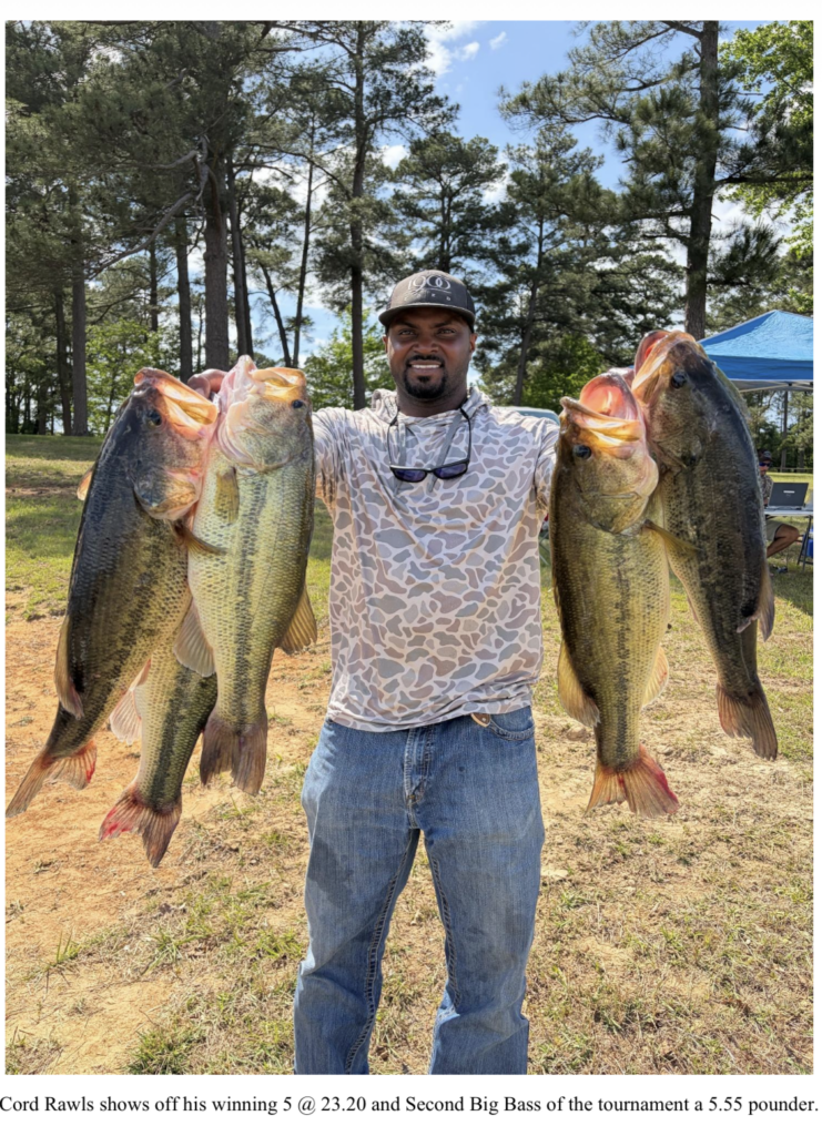 Cord Rawls with the Vidor Bass Anglers Association captured the win with 5 bass weighing 23.20 pounds, anchored by the second Big Bass of the tournament a 5.55 pounder. Cord stated that he targeted hard spots with rock and clay leading out of spawning pockets using a Carolina rig and a jig on the points, as well as a mooch minnow.