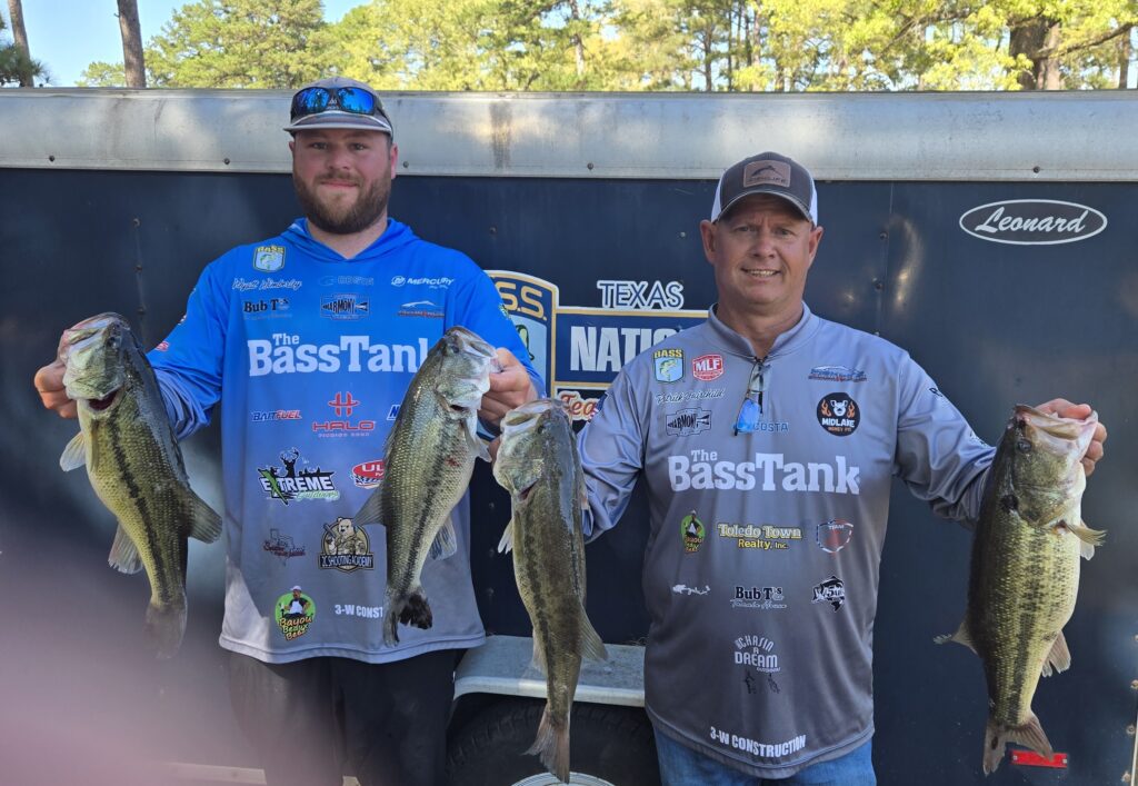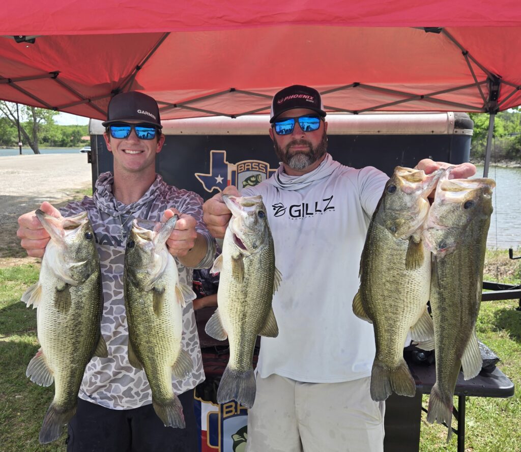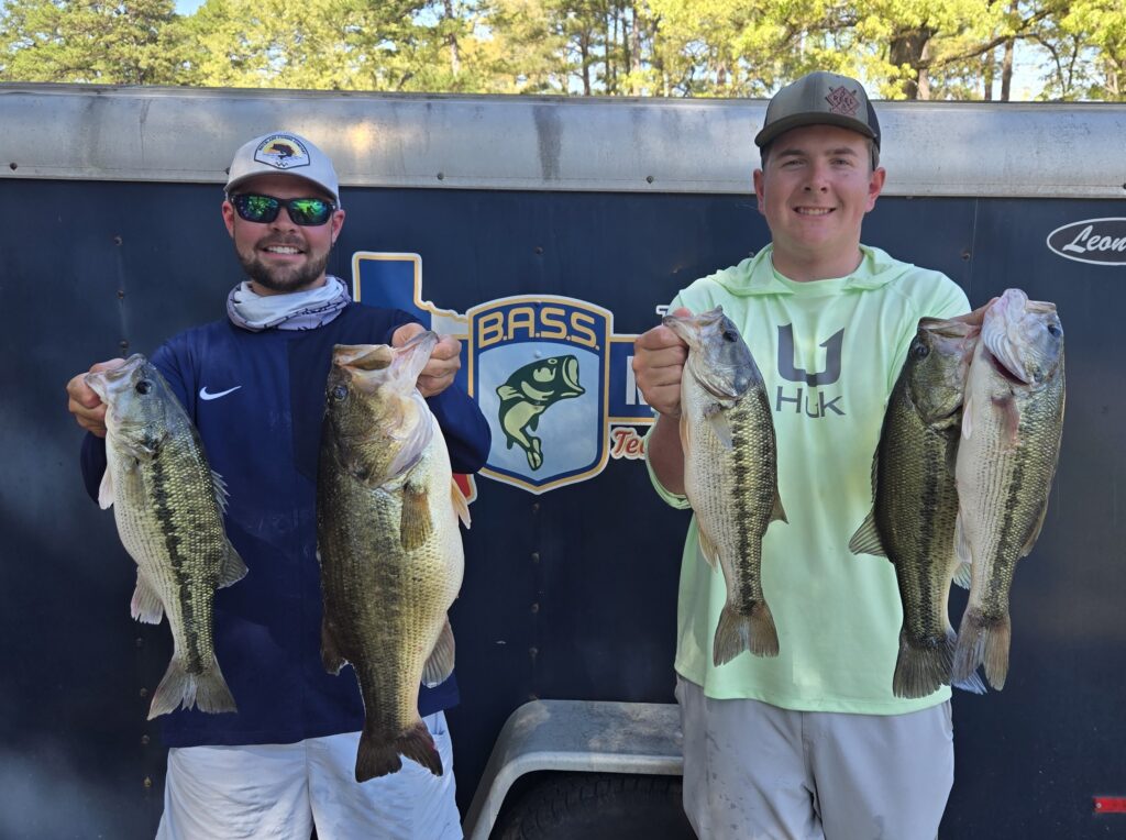 Every team brought a five fish limit in the scales that day. The Team of Patrick Fairchild & Wyatt Wimberley from Broaddus, TX (Sam Rayburn) had a 19.62 lb sack to take first place. That bag earned them a check for $508. They caught 2 fish each day of practice and decided to just go fishing on tournament day. They found the right ones on main lake points with rocks using their electonics from The BassTank. Their lure of choice was a NetBait Paca Bug jig with a Netbait mini kicking trailer flavored with Bait Fuel. Their 7′ 6″ medium heavy and 7′ 2″ jig Halo rods helped them put it where it counted. Congratulations!