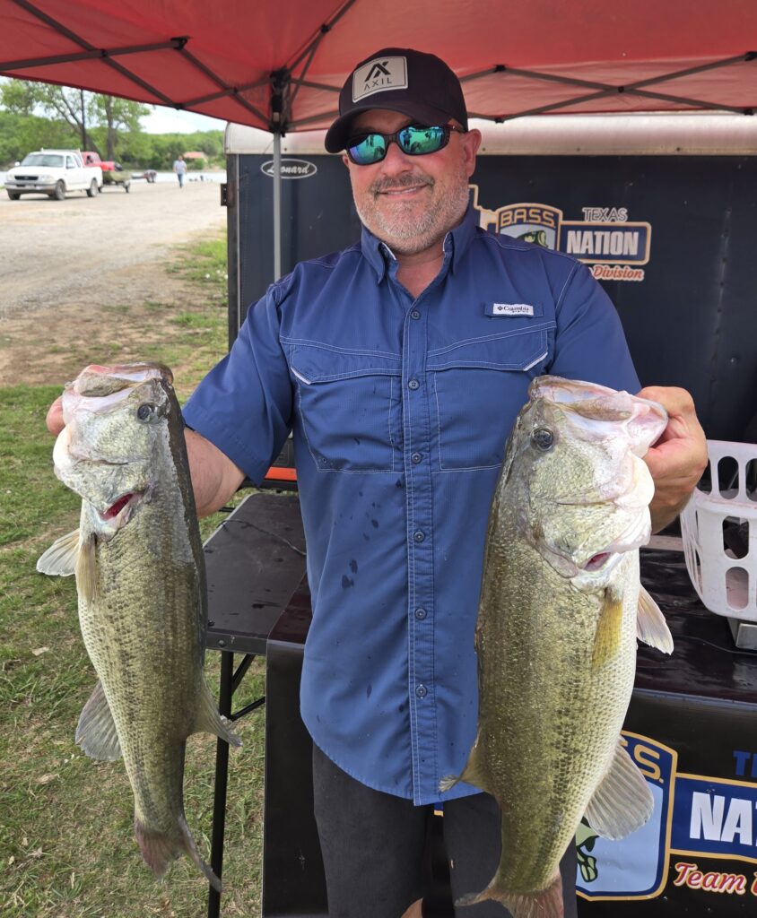 Rob Paxton and Dan Beard had a great day on Wacky Waco.   As the bite slowed and the winds got faster they used chicken rigs, big TRD’s and Senkos also in 4 to 10 ft of water.   Their method was to move baits very slowly.   It paid off with a sack of 5 weighing in at 19.31 lbs anchored by the biggest fish on the day tipping the scale to 7.32 lbs   Big Bass and 2nd earned them $890.00